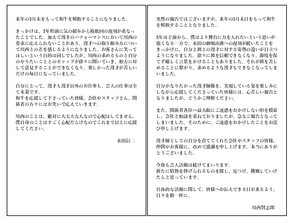 2023.12.12 和牛解散のご報告 弊社所属 和牛が2024年3月末をもちまして、コンビを解散することになりましたのでご報告します。水田信二(みずた・しんじ、43歳)と川西賢志郎(かわにし・けんしろう、39歳)は今後、弊社所属のまま、それぞれの道を歩んでいくことになりました。これまで、和牛に多大なご声援をいただきましたファンの皆様、関係者各位には心より感謝いたしますとともに、引き続き2人にご支援を賜りますようお願い申し上げます。
