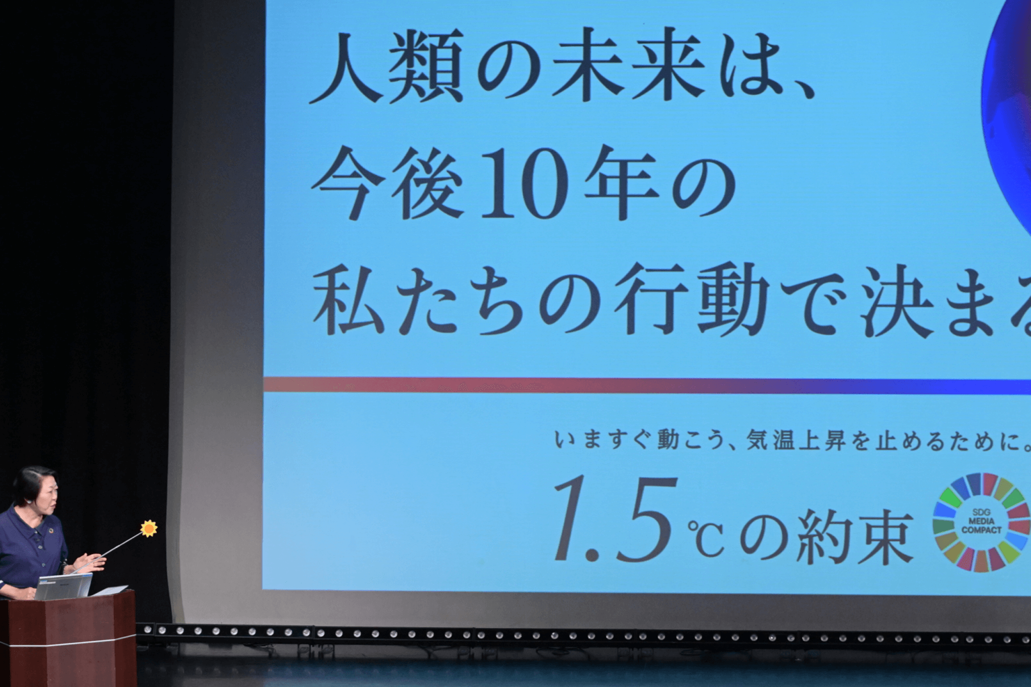 最後は根本による授業『国連〜世界の人々はどうしているのか?』を。国連のグテーレス事務総長の紹介などのほか、国連と日本のメディアで「1.5℃の約束 – いますぐ動こう、気温上昇を止めるために。」というキャンペーンも推進中とアピール。「正しく学び、自分事として、自分は何ができるのか。みんなが力を合わせてやればまだ間に合います」と声に力を込めました。