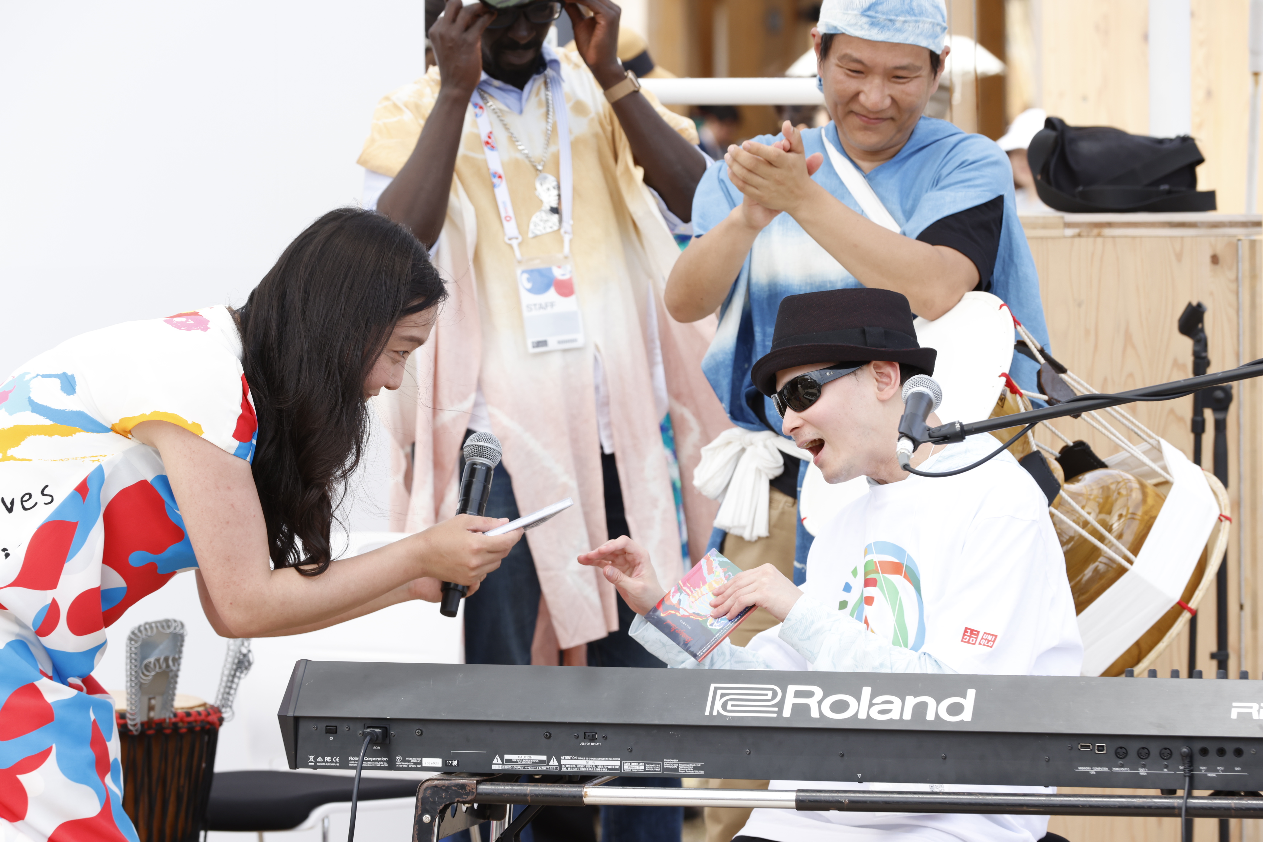 3曲が披露され、感想を聞かれると、中島氏は「初めてお会いした木下さんとのセッションがあるなど、万博会場には奇跡が多い」とのこと。木下氏は「この時間をみなさんと共有できてうれしいです」と述べました。そして、互いのCDを交換しあいました。