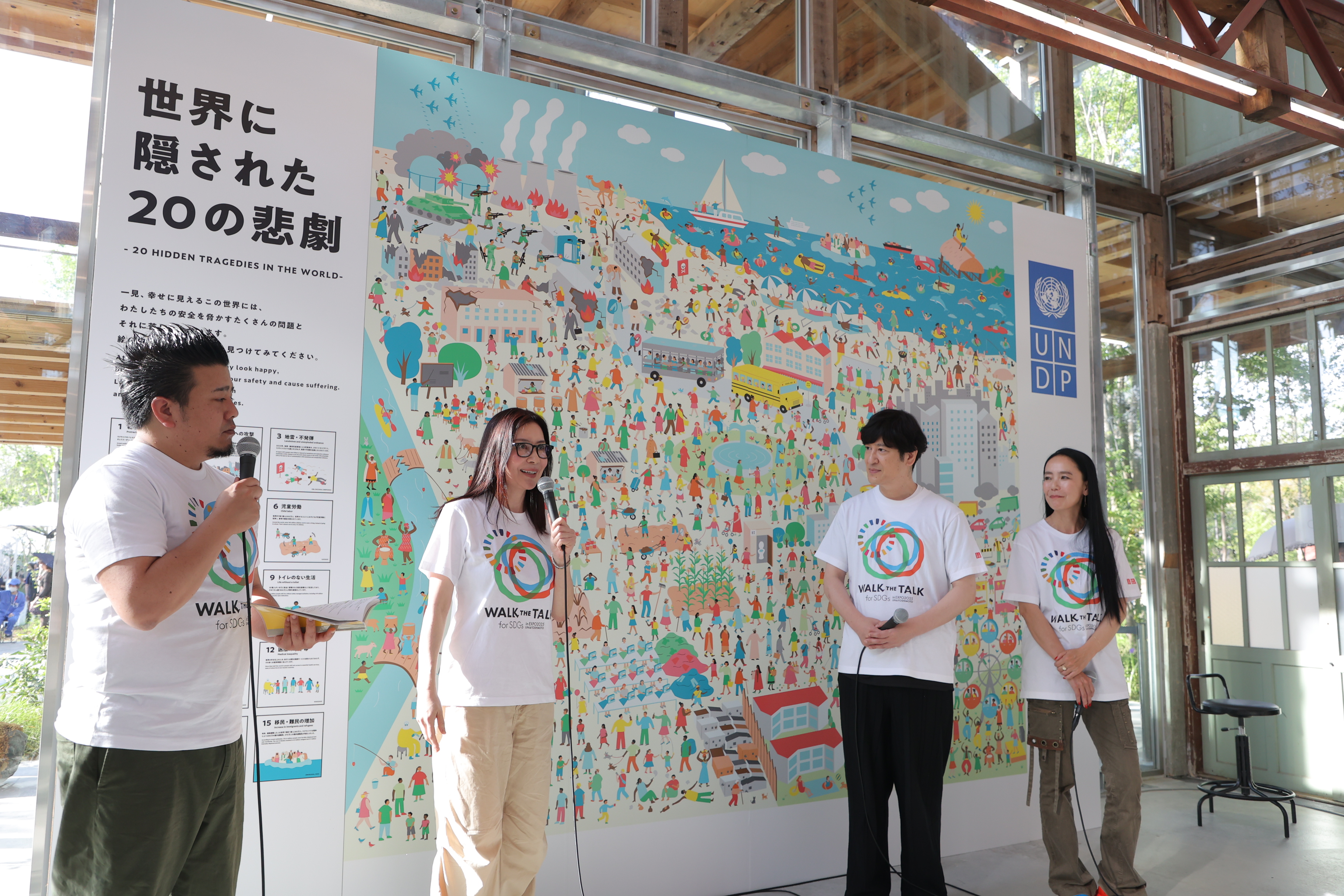 ここでステージの後ろにあるパネルについての説明が。ロジャーは、これが世界約170か国で途上国を支援する国連開発計画(UNDP)により創られた「世界に隠された20の悲劇」という作品と説明。