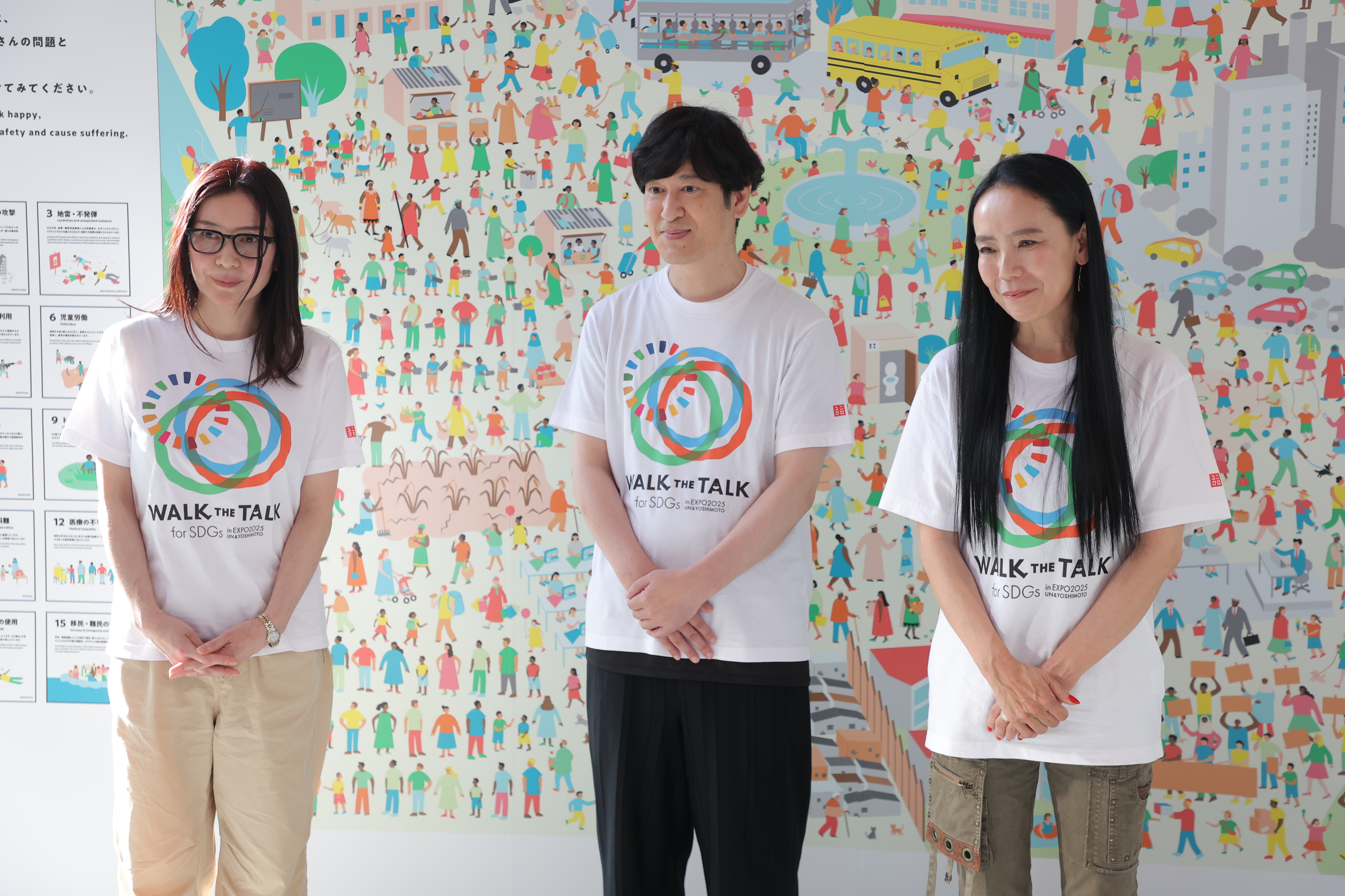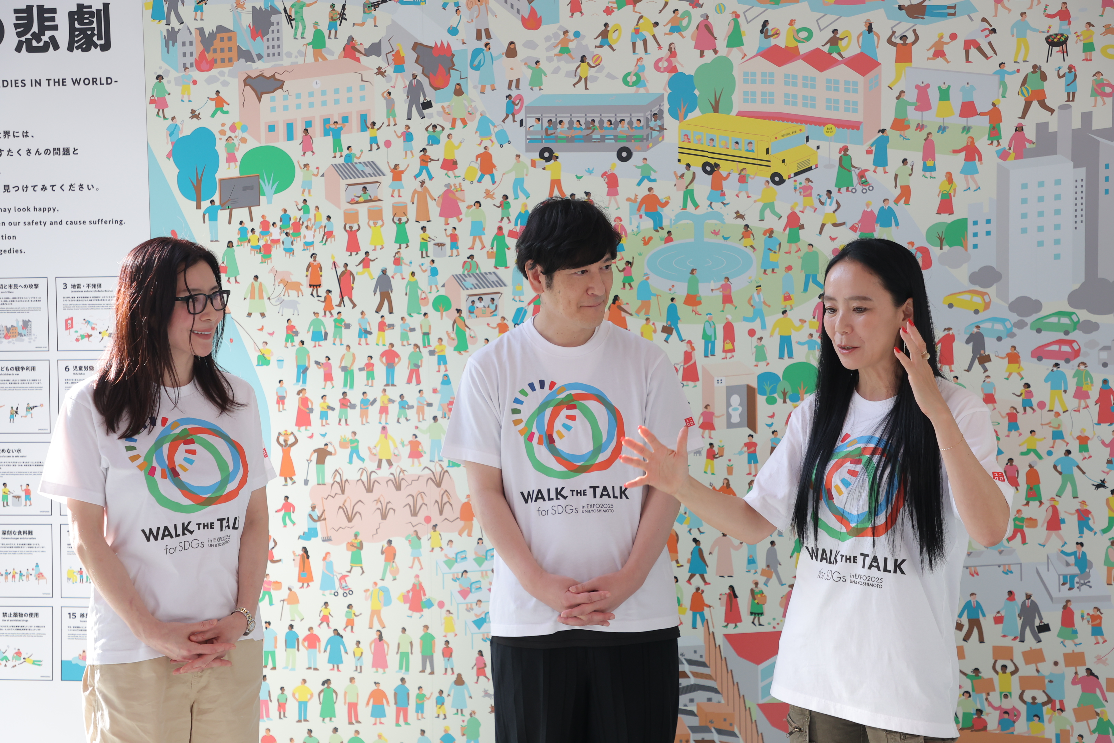 シグネチャーパビリオン「Dialogue Theater – いのちのあかし – 」は、「対話」を通じて、世界の至るところにある「分断」を明らかにし、解決を試みる実験場。万博期間中、毎日違う問いかけについて、知らない者同士が対話しています。今回はパビリオン敷地内にある「森の集会所」でトークショーを実施。「世界に隠れされた20の悲劇」をテーマに、3者が「対話」を行いました。
