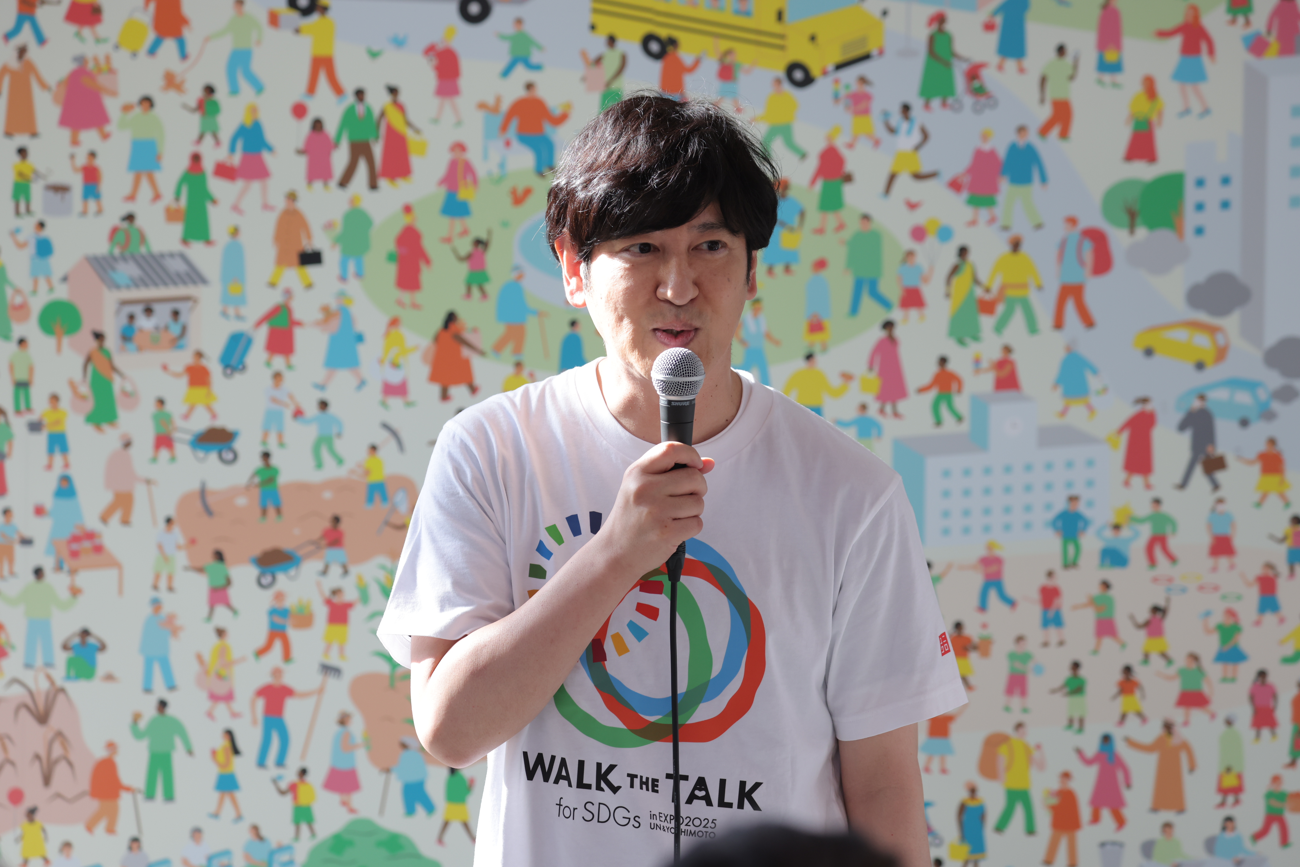 MCを務めるのは大自然・ロジャー。まずは『Walk the Talk for SDGs in EXPO2025UN&YOSHIMOTO』について説明。そして出演者3人を紹介します。田中はロジャーに負けじと低音ボイスで笑いを誘います。