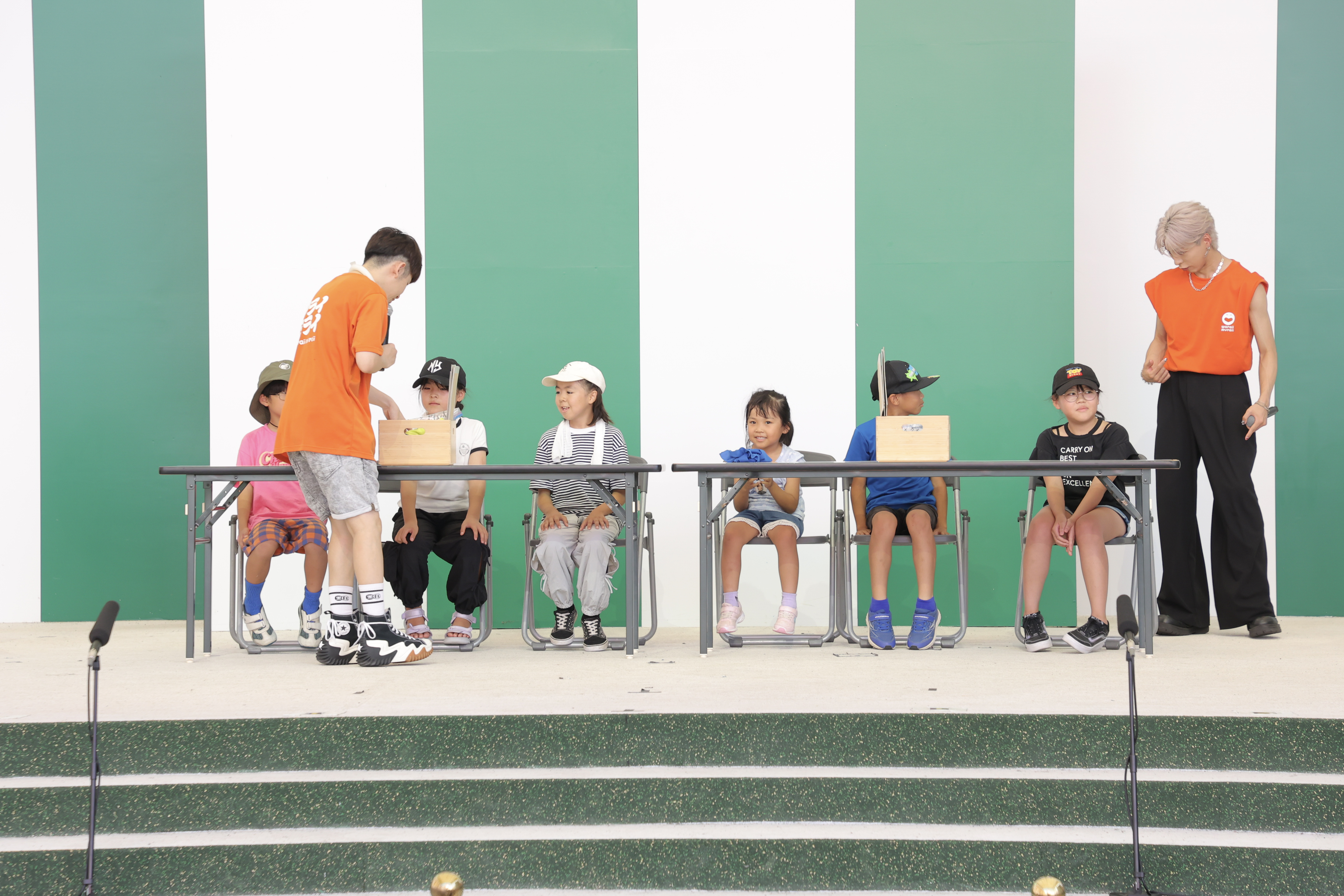 そのTシャツを使って、来場者も参加する「ゆるゆる目標“ぎょもT”を作ろう!」のコーナーへ。子どもたちを中心とした会場からの希望者10人が、OWVと一緒に、吹き出しが描かれたTシャツに「アシタにはできるかも? ゆるゆる目標」を入れて、オリジナルTシャツ作りにチャレンジします。